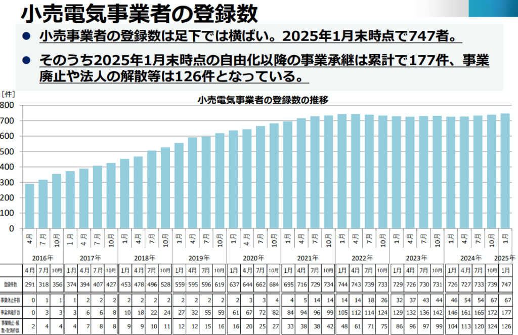 また、現在は電力自由化により、2025年1月末時点で747者の新電力会社が参入しているため、選択肢が豊富です。