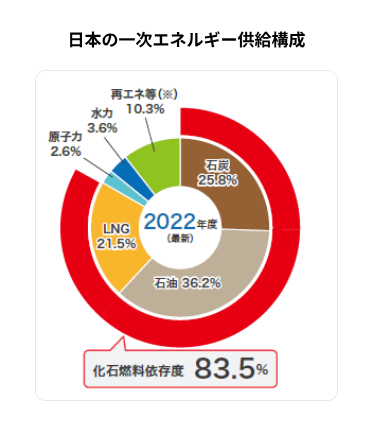 日本で利用されているエネルギーのうち、石油・石炭・天然ガスなどの化石燃料が83.5%を占めています。