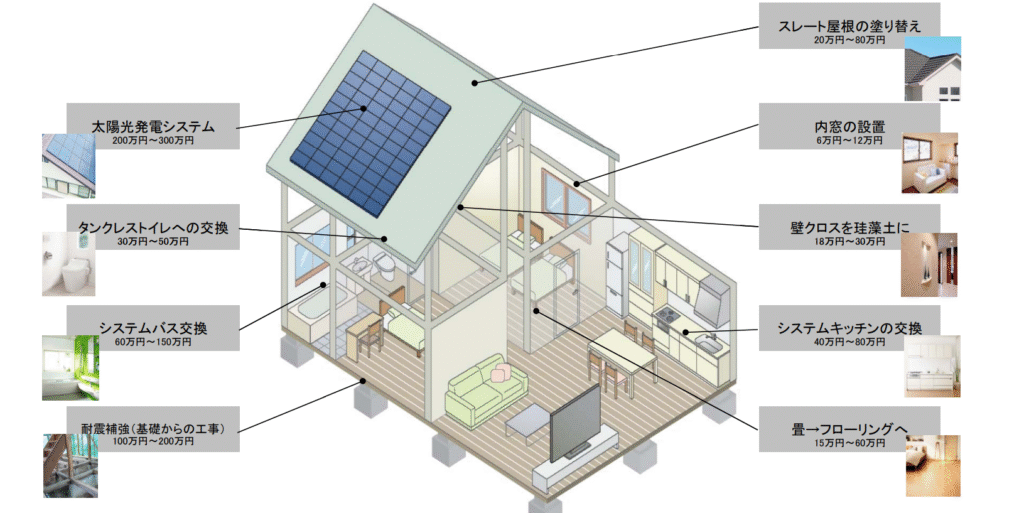 例えば、国土交通省が提示している「リフォームの内容と価格について」では、屋根の塗り替え20〜80万円、タンクレストイレへの交換30〜50万円、タンクレストイレへの交換60〜150万円が相場とされています。