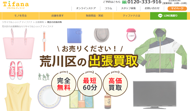リサイクルショップティファナ | 買取方法:出張/店頭/宅配 電話番号:0120-333-916 営業時間:10:00~20:00 |