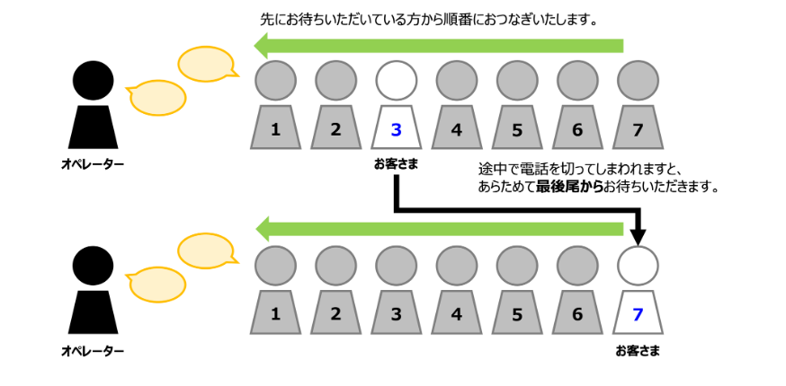 また、途中で電話を切った場合、あらためて最後尾からの案内となるため、順番待ちが可能な際はそのまま待ちましょう。