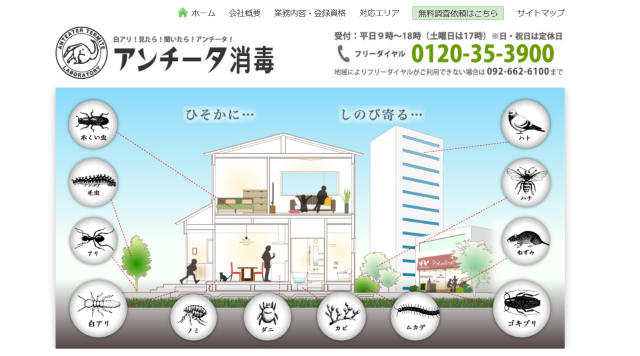 株式会社アンチータは福岡県で長年の実績を持つ害虫・害獣駆除業者で、昭和の創業以来、地域に密着したサービスを行ってきた点が評価されています。