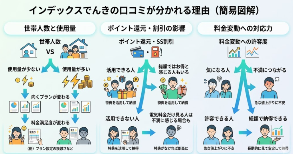 イデックスでんきの口コミの評価が分かれる理由は、サービス内容に対する不満ではなく、世帯人数や使用量、契約プランで満足度が異なるからです。