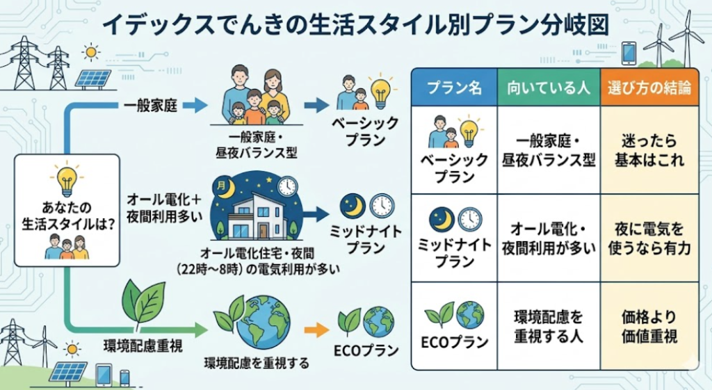 イデックスでんきの口コミ差は、会社への不満ではなく、ベーシックプランとミッドナイトプランの選び方で大きく変わることです。