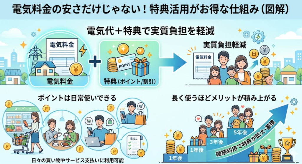 電気料金単体では他社と大きな差が出ない場合でも、ポイント還元や割引を日常的に使う人は、総額で見たときにメリットを感じられます。