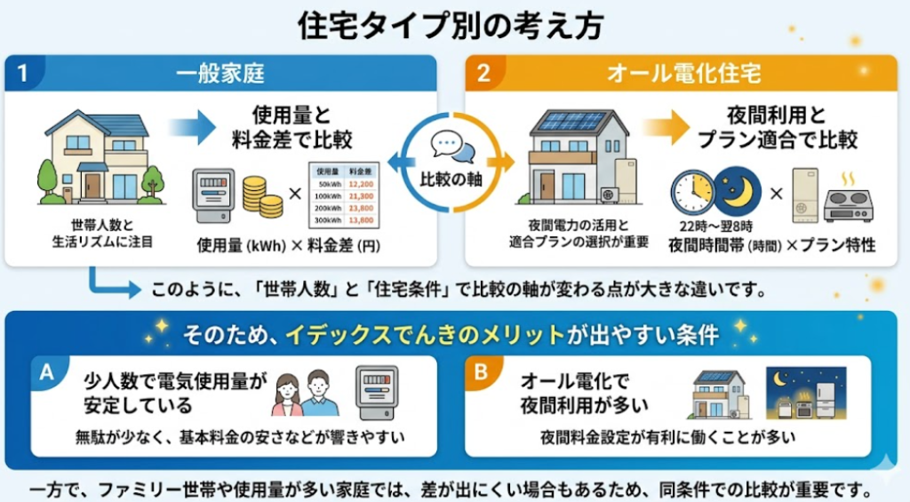 イデックスでんきは誰でも安くなるわけではなく、少人数世帯やオール電化世帯、ポイント還元重視の人と相性がよい電力会社です。
