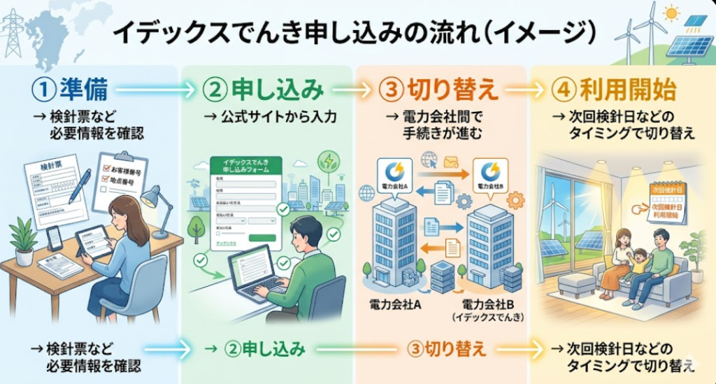 イデックスでんきの申し込みはWebで完結し、現在の電力会社の解約も基本的に自動で進みます。
