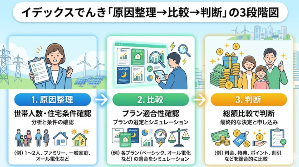 イデックスでんきは1〜2人暮らしやオール電化世帯なら候補になりますが、3人以上世帯や最安重視の人は他社比較を優先してください